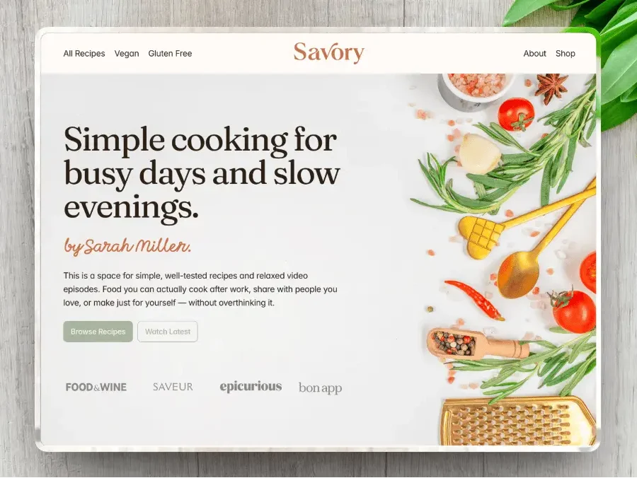 A warm, modern Framer template for food creators. Share recipes, write blog content, and sell digital products from one beautifully designed website.